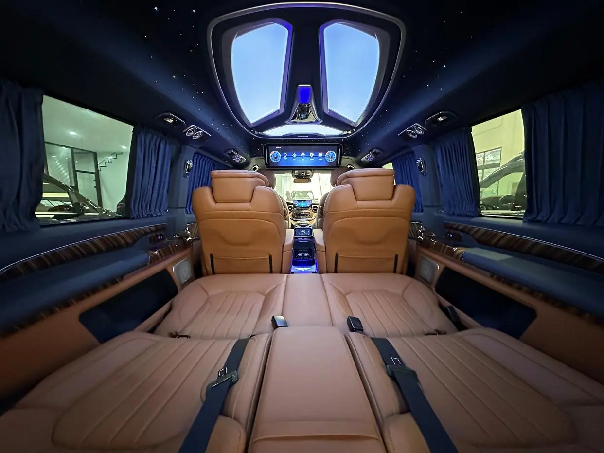 打开原厂的电动侧滑门内饰配色先给大家来说一下,整体是一个棕咖的配色,非常的具有商务感。二排航空头等舱真皮座椅,功能有通风加热按摩、旋转记忆、电动腿托、电动调节和无线充电。三排是一个180度分明的沙发床可以放平,这个咱们当床睡也是没问题。