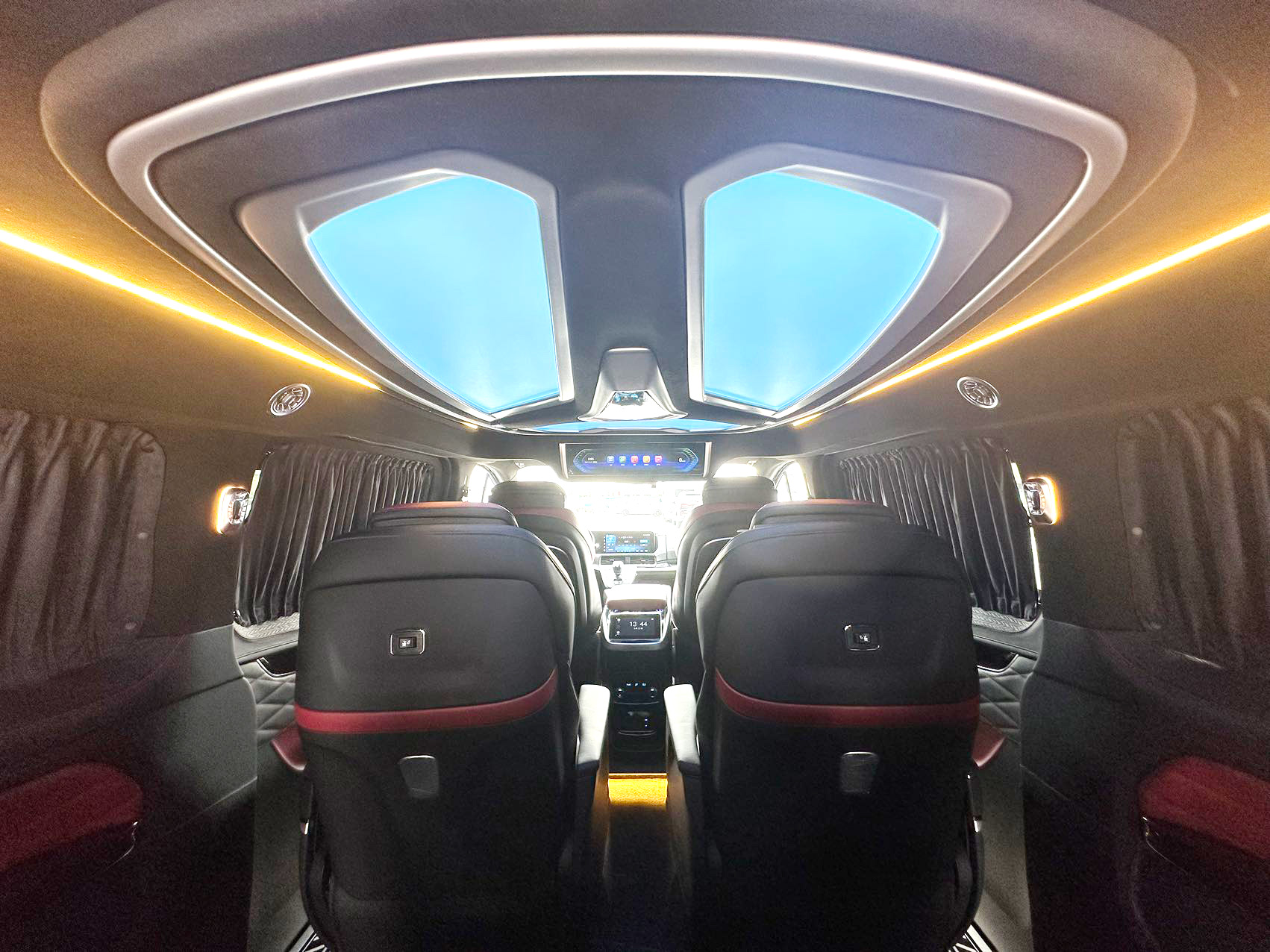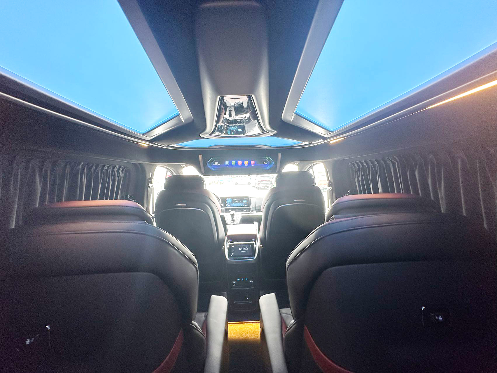 顶部无线网络电视机,车子WiFi手机热点都可以直接连接使用,而且整车还升级了音响,用的是VV-car影院级别的环绕音响,坐在车内,试听感受很赞。