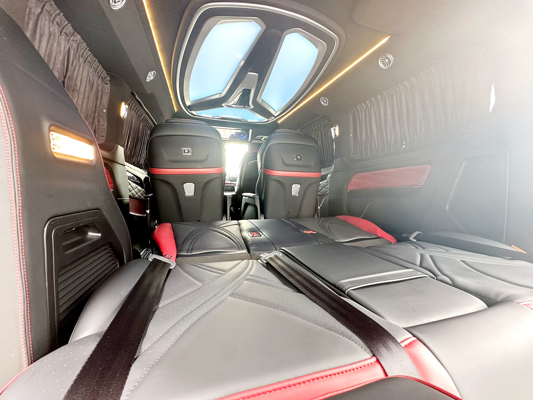 这款车的第三排是三联排的沙发床,可以180度的进行平躺,最后一排可以乘坐三人。日常出行想在车内休息一下,还是很惬意的一件事。