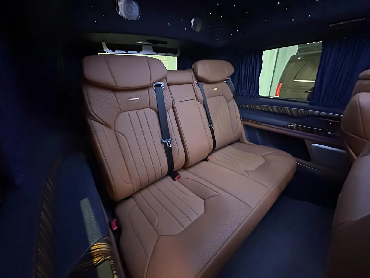 打开原厂的电动侧滑门内饰配色先给大家来说一下,整体是一个棕咖的配色,非常的具有商务感。二排航空头等舱真皮座椅,功能有通风加热按摩、旋转记忆、电动腿托、电动调节和无线充电。三排是一个180度分明的沙发床可以放平,这个咱们当床睡也是没问题。