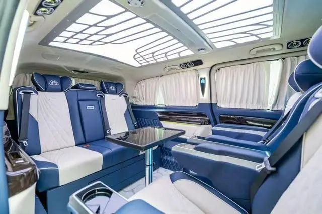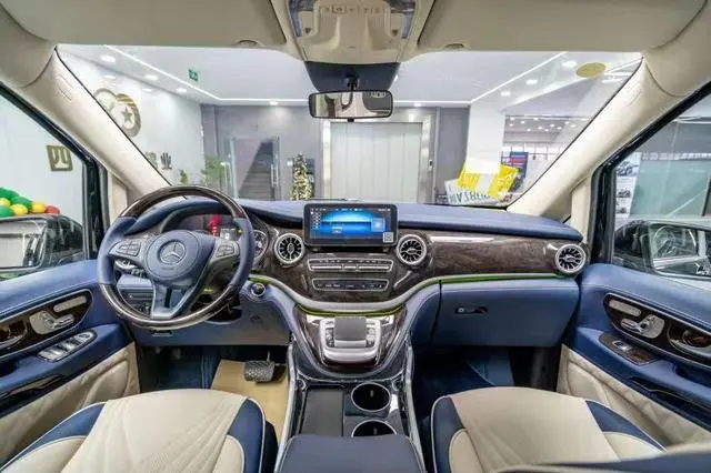 车内选用时尚且不易产生审美疲劳的宝石蓝搭配象牙白,宛如蓝天白云让人心旷神怡。全新升级v260同款仪表台,腰线以下全部采用NAPPA皮进行手工包覆,顶棚以及ABCD柱采用alcantara材质进行包覆。桃木饰板和真皮双拼的方向盘质感更佳。主副座椅带电动调节,通风加热以及记忆功能。中央一体式扶手箱有恒温冰箱,手机无线充电以及杯架。